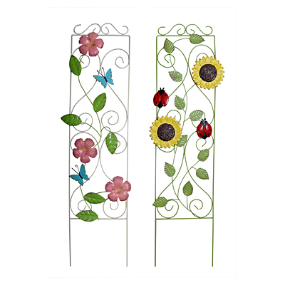 Садовое ограждение-решетка для вьющихся растений в виде решетки с цветными металлическими цветками.