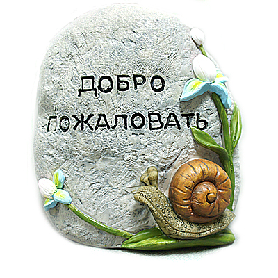 Фигурка в виде камня с надписью «Добро пожаловать» и улиткой, которая ползет по стеблю.