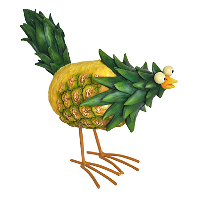 Декоративная фигура для сада в виде петуха, сделанного из ананасов.