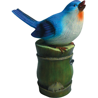 Декоративная фигура для сада в виде маленькой ярко окрашенной птички, которая сидит на ветке.